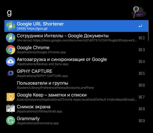 Вся работа с Альфредом идет через командную строку — это такое маленькое окошко, которое открывается поверх всех окон. В командной строке можно вводить команды (кэп), запускать скрипты, искать файлы на компе и закладки в браузере. Найденный файл или закладку можно сразу открыть, а приложение — запустить.