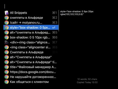 Если мне часто нужно писать один и тот же текст, я сохраняю его в Альфреде и придумываю короткий заголовок. Теперь вместо того, чтобы каждый раз вводить этот текст, я просто пишу заголовок — и загружается сохраненный сниппет.