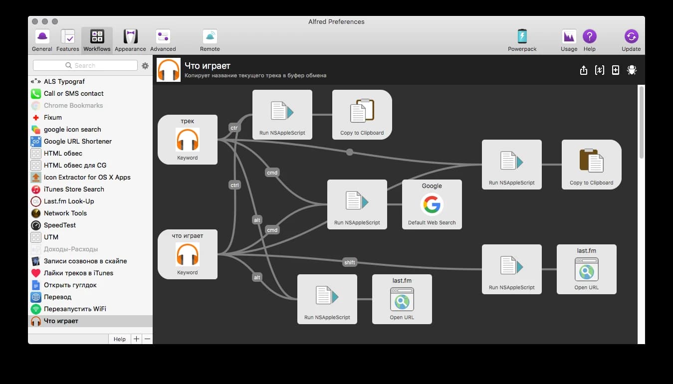 Они здесь называются «воркфлоу». Для тех, кто не знает: скрипт — это как бы отдельная программка внутри Альфреда. Можно накодить любую хрень, запустить скрипт — и хрень выполнится. Например: