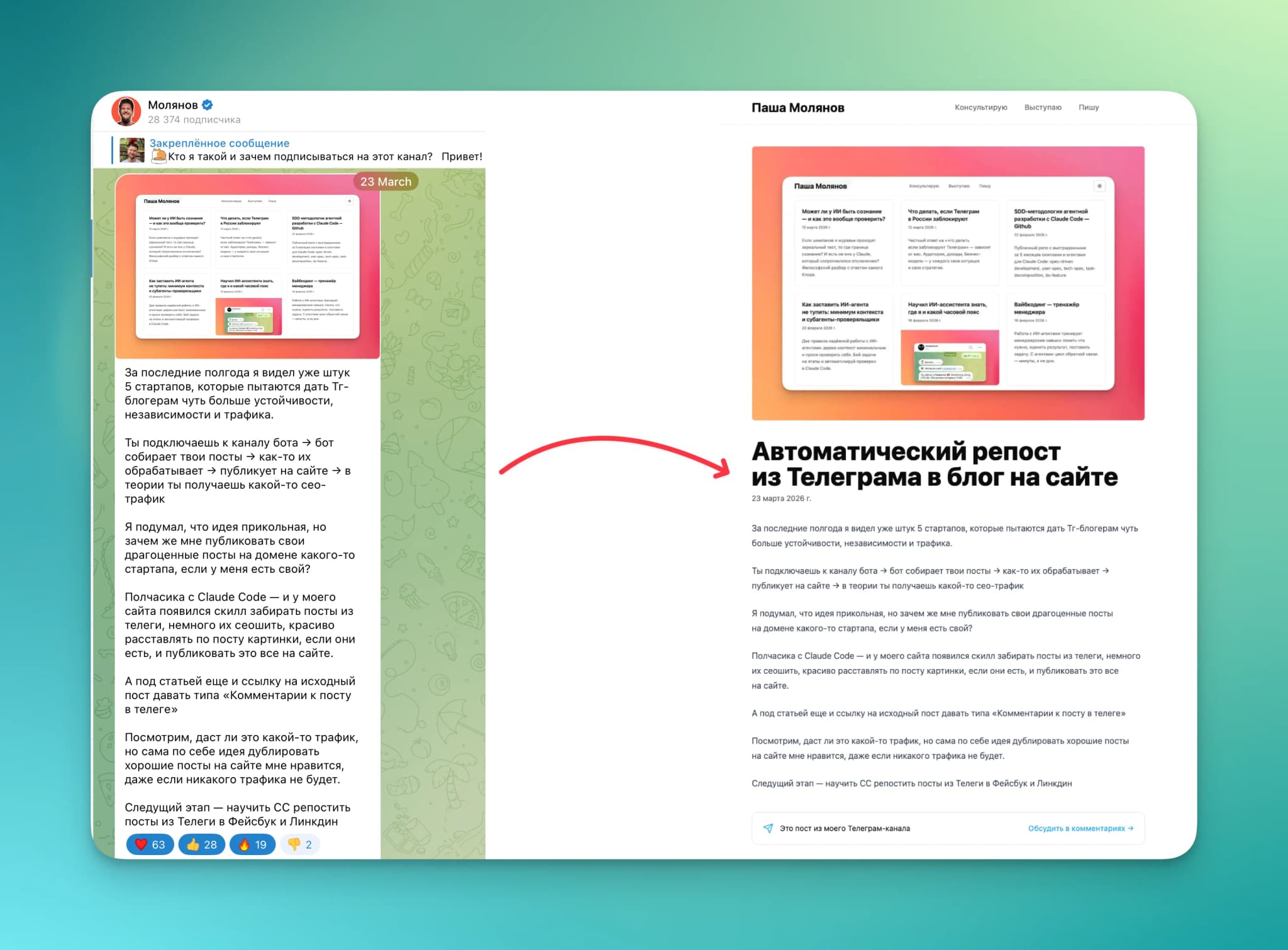 Раз сайтом управляет Claude Code, я просто написал для него скилл, который берёт пост из моего Телеграм-канала и превращает его в статью на сайте. CC расставляет картинки по тексту, пишет заголовок, если в посте его не было, генерирует title и description для SEO, ставит дату публикации из Телеграма — и закидывает всё на сайт.