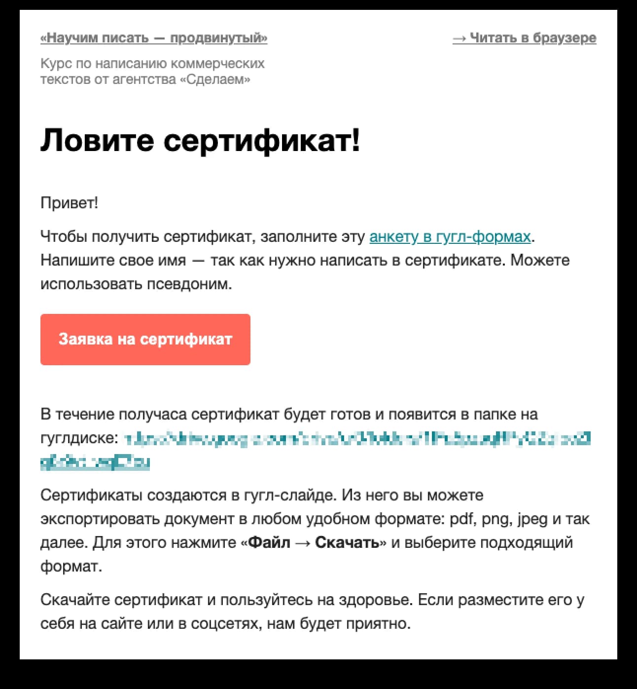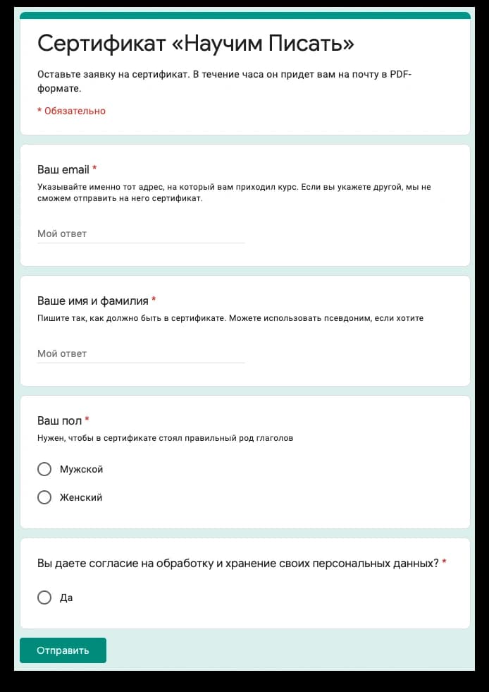 После курса подписчикам приходит письмо со ссылкой на Google-форму.