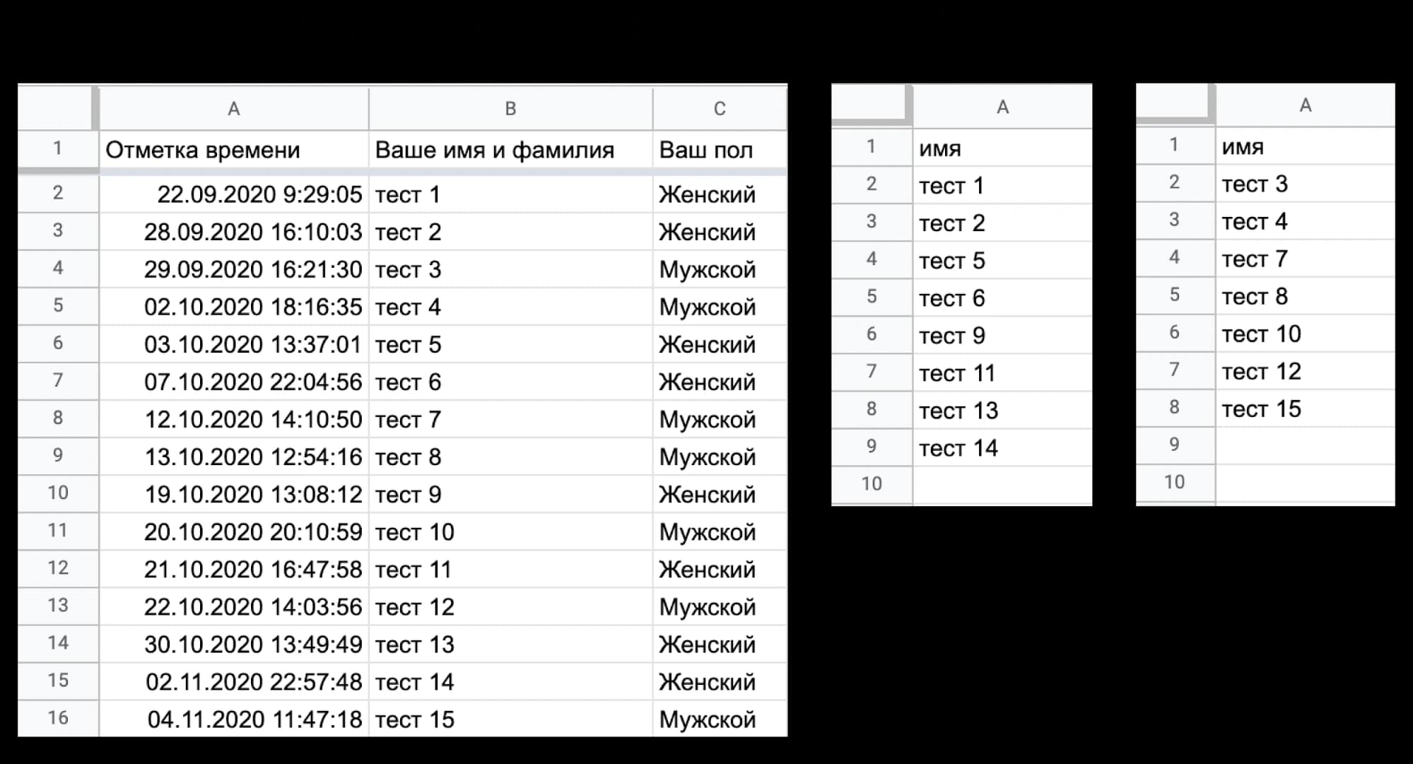 Сейчас в таблице будет всего одна вкладка, связанная с формой, — в нее попадают все ответы. Нам надо разделить подписчиков, чтобы на одной вкладке были женщины, а на другой мужчины.