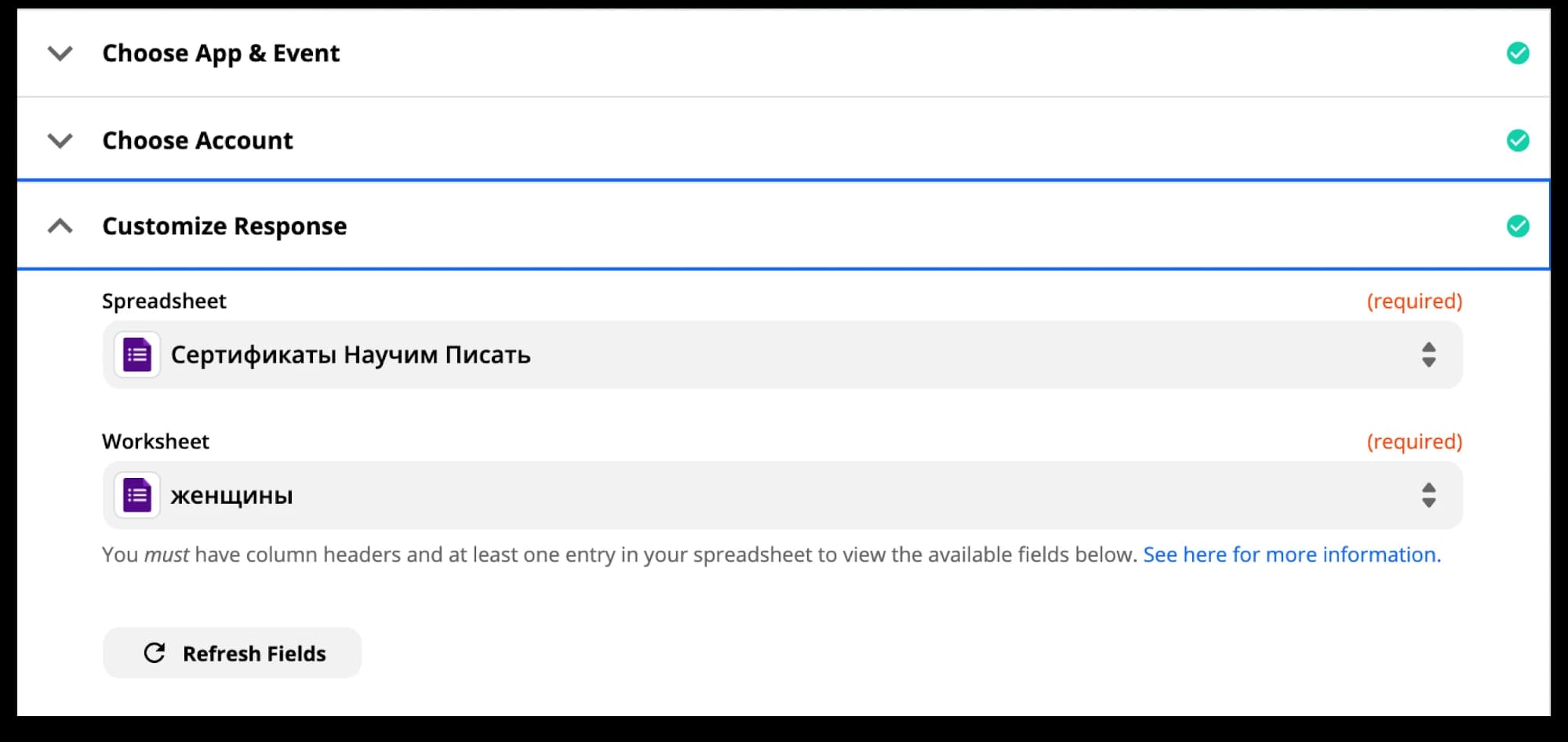 Находим в списке Spreadsheet нашу таблицу, а в Worksheet выбираем вкладку с выпускниками-женщинами. Если сервис тупит и не видит вашей таблицы, нажмите Refresh Fields.