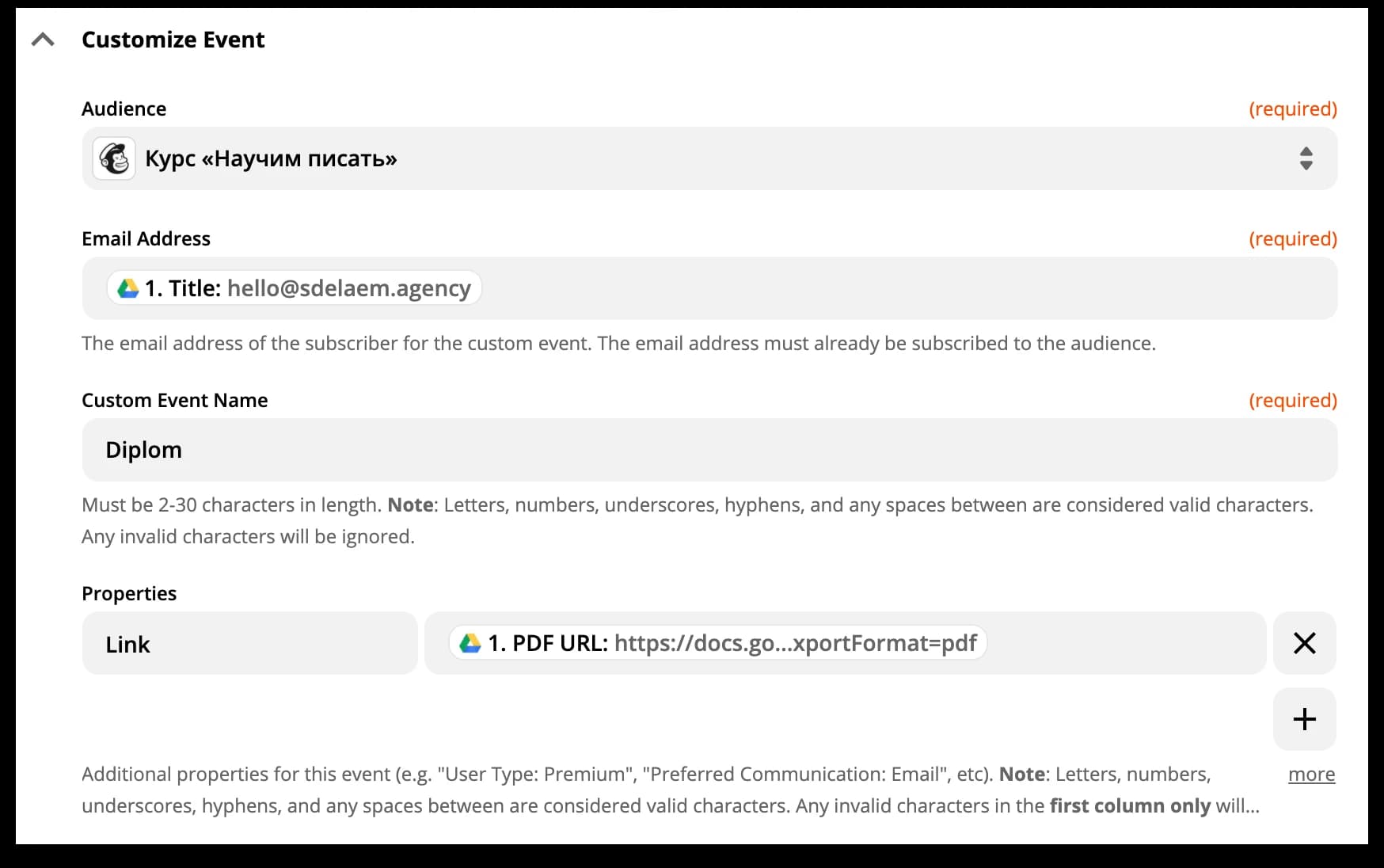 Я создал еще одну автоматизацию в Zapier — она находит новые дипломы в папке и добавляет их в Mailchimp в виде пользовательского события.