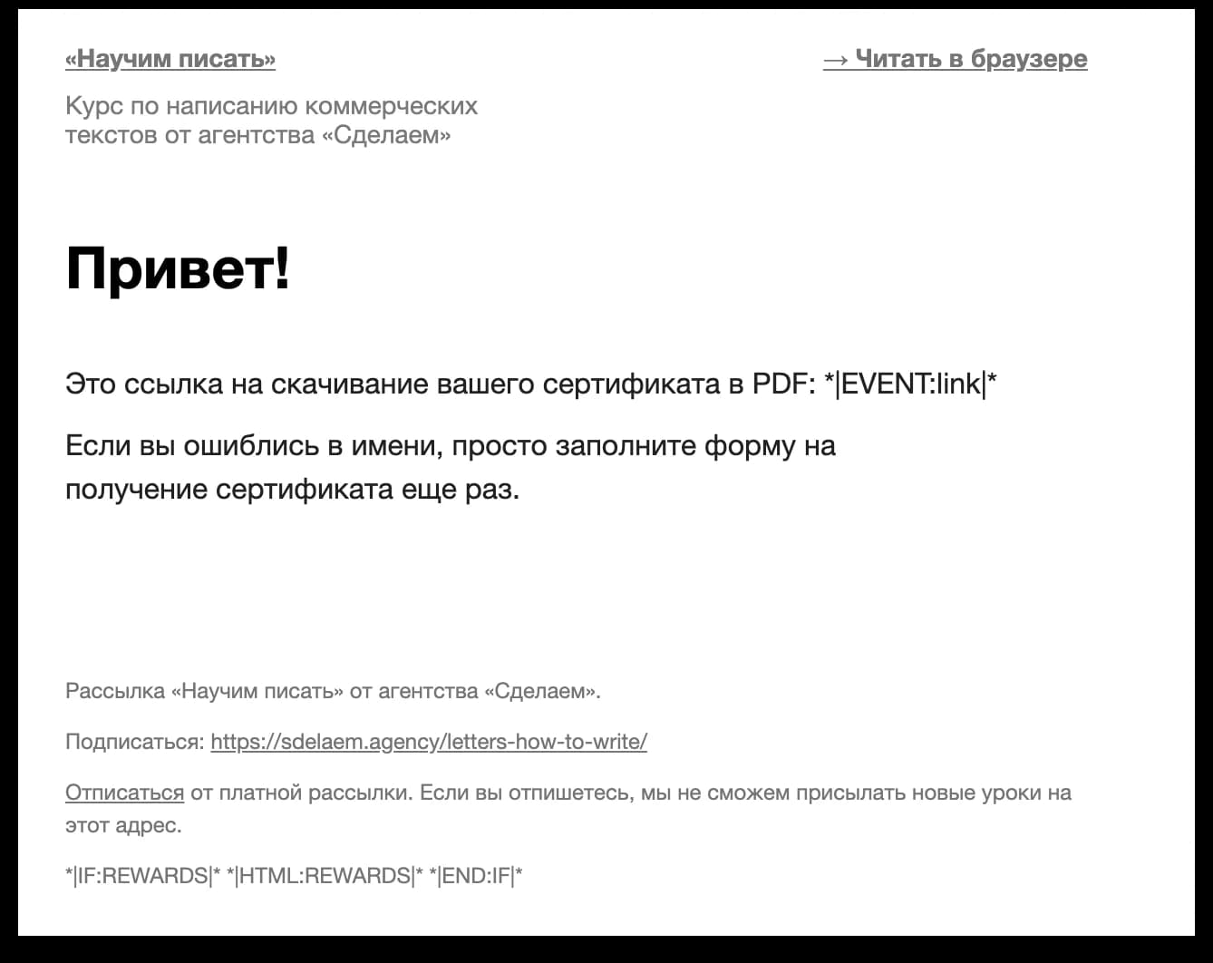 Создаем письмо, оформляем на свой вкус и в том месте, где должна быть ссылка на сертификат, пишем *|EVENT:link|*