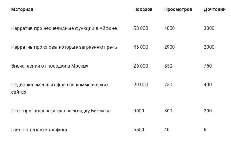 Я собрал все, что когда-либо писал, и скопипастил на Дзен. Собрал длинные посты с сайта, короткие заметки с соцсетей — и залил на канал. Из некоторых постов сделал нарративы. Что-то дало совсем чуть-чуть пользы, что-то выстрелило — и за 4 дня набралось 7000 дочтений.
