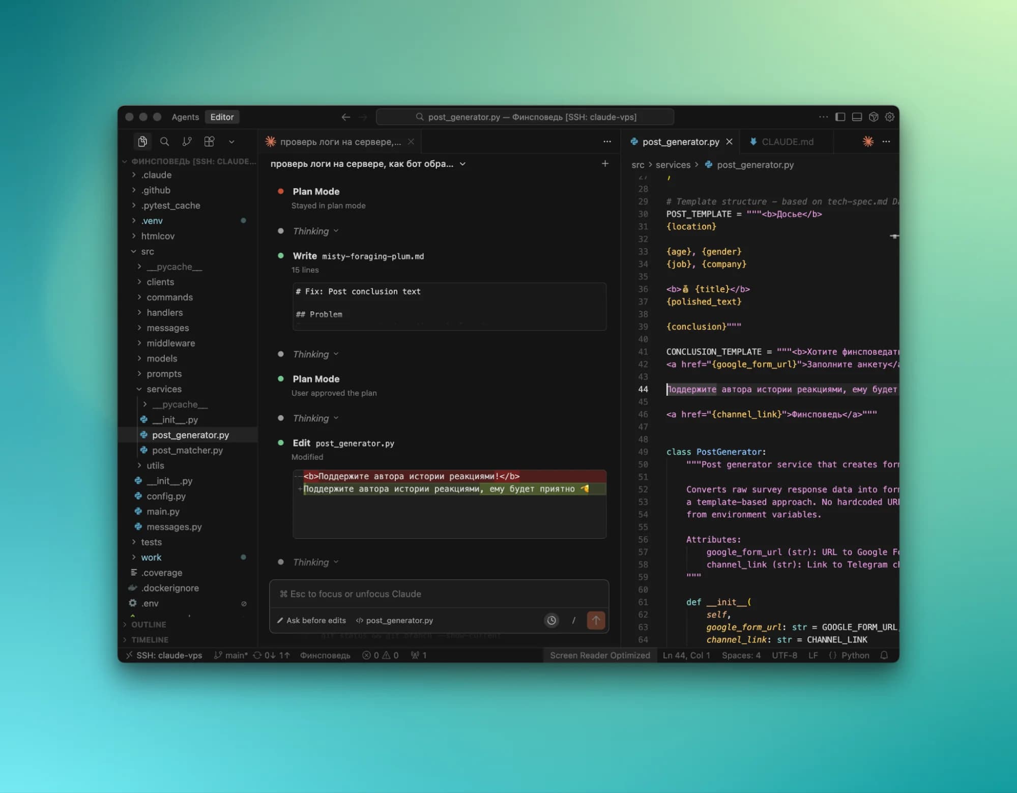 А иногда план кажется понятным и логичным — и я прошу агента его реализовать.