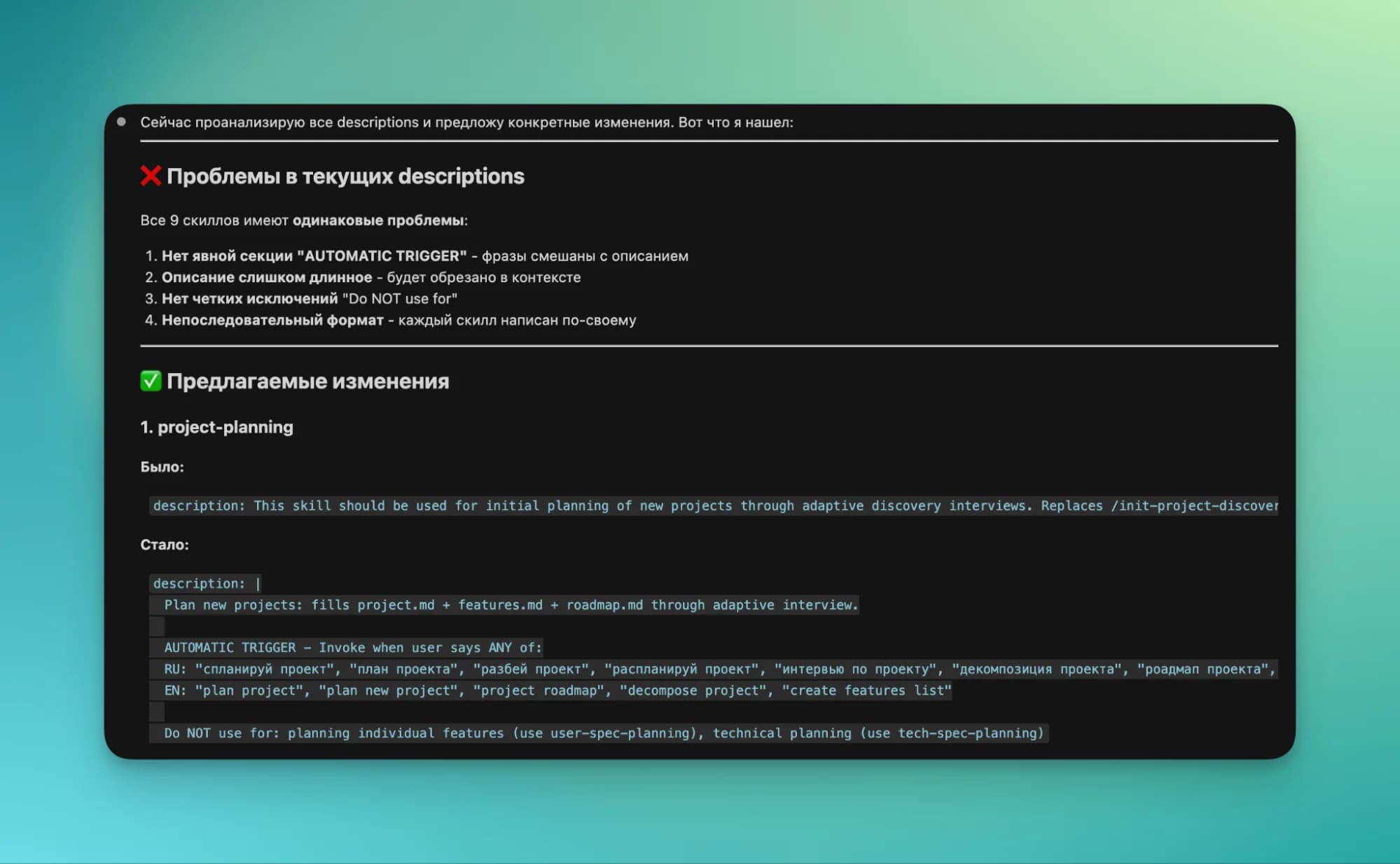 Повторюсь. Планирование — это критически важный шаг. Если вы не разработчик, вы просто не поймете, что сделала нейронка, насколько это адекватно, не сломала ли она что-то в процессе. А план можно разжевать максимально подробно, понять и согласовать все решения, увидеть потенциальные проблемы и так далее.