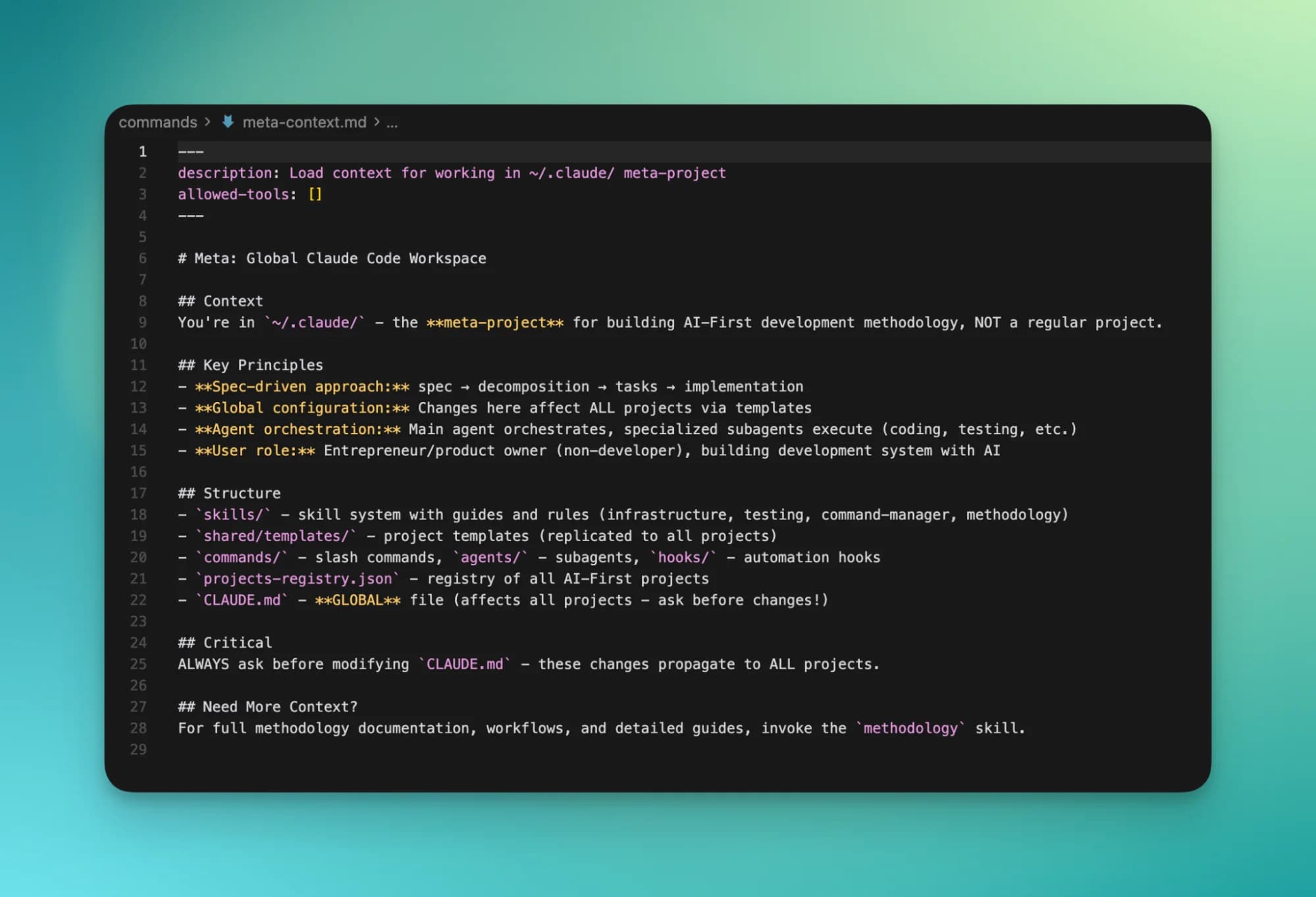 У меня, например, есть команда /meta-context, которую я ввожу, когда хочу поправить какие-то команды, шаблоны и так далее. Она вгружает в агента информацию, что сейчас мы будем работать не над текущим проектом, а над глобальными настройками Claude Code, которые действуют на всех проектах сразу.